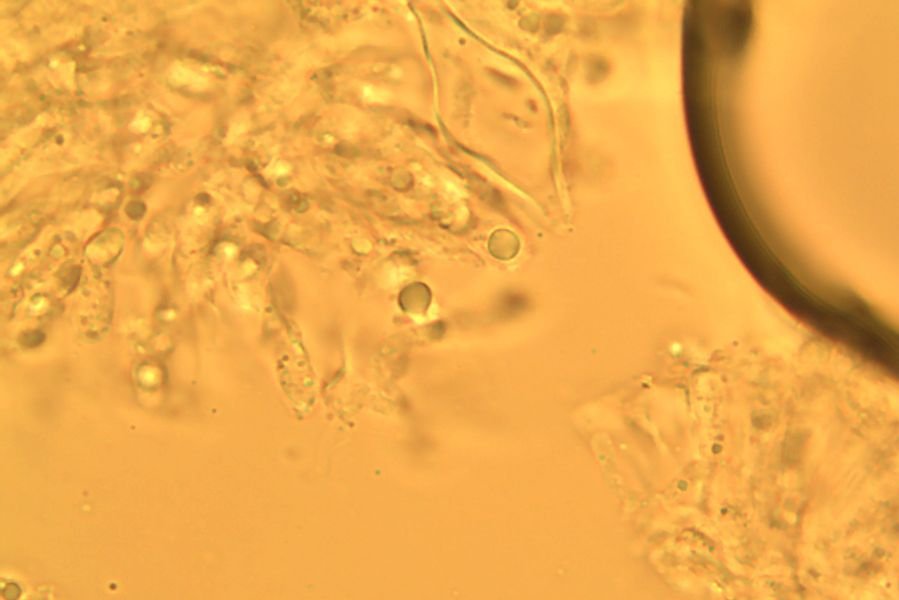 19.10.2025 Jižní Čechy, rozhraní louky a lesíka na vápencích.Na mikrosnímku v horní části velká, lahvicovitá cystida, typická pro tento druh. Leg., mikrodet. P. Moran.
