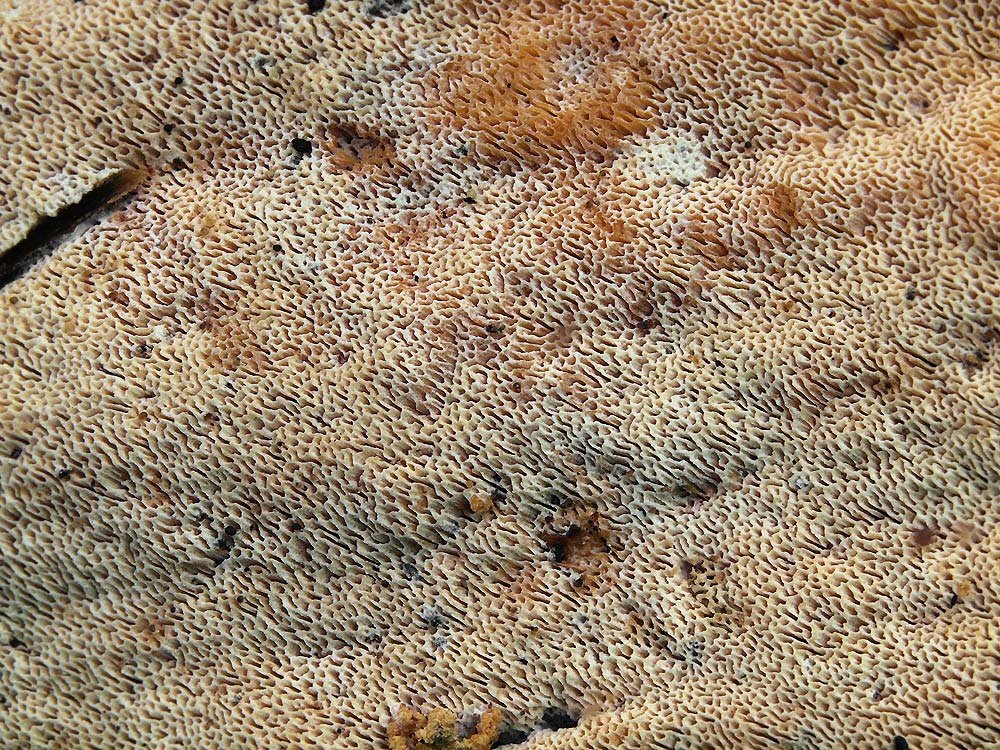 25.8.2013 na větvi listnáče (habr?), Hamrštejn u Liberce,350mnm. Detail pórů zralejší plodnice.